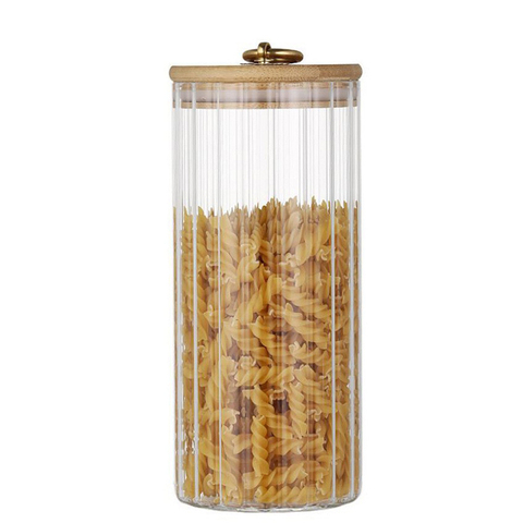 Tarro de almacenamiento de alimentos de vidrio con diseño de rayas con tapa de bambú, tarros de contenedor de almacenamiento de vidrio personalizados