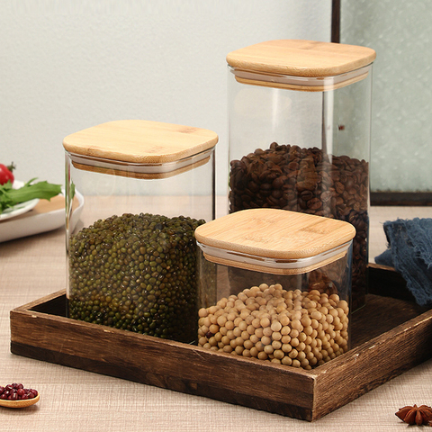 Juego de tarros de vidrio cuadrados de alto borosilicato, diseño moderno con tapa de bambú sellada, diferentes tamaños disponibles para el almacenamiento de alimentos en la cocina